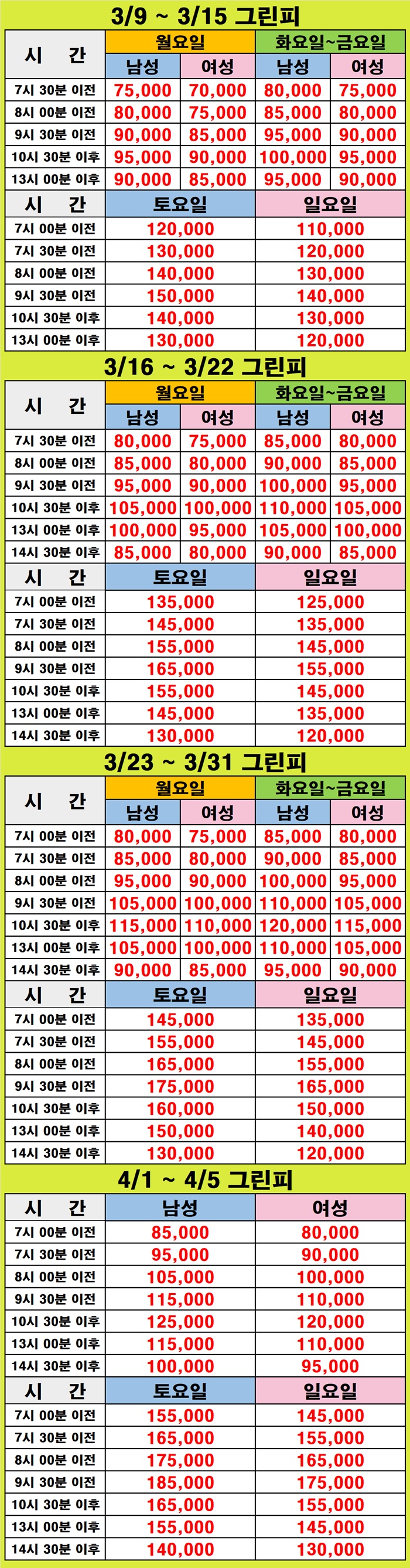 3/9~ 4/5 그린피 안내